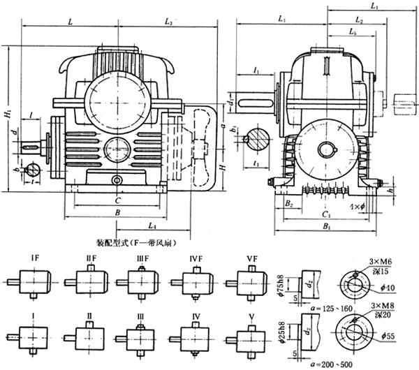 工作條件:蝸桿轉速不超過1500r/min;工作環(huán)境溫度為+40-40。C,當工作環(huán)境溫度0。C以下時,啟動前潤滑油必須加熱到0。C以上,或采用低凝固點的潤滑油;當環(huán)境溫度超過40。C時,需采取強迫冷卻措施。