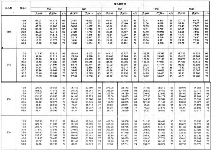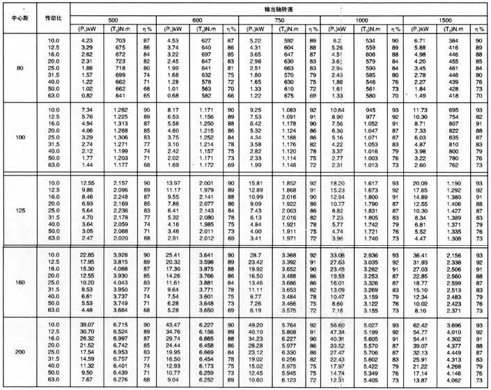 2.表中額定輸入功率P1及額定輸出扭矩T2,適用于TPU、TPS型減速器,工作載荷平穩(wěn)無沖擊,每日工作8h,每小時啟動10次,啟動扭矩為輸出扭矩的2.5倍,小時負荷率jc=100%,環(huán)境溫度為20。